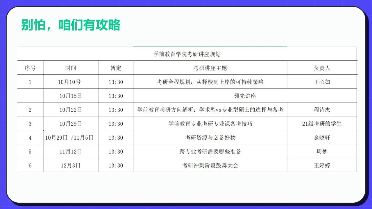 考研工作倍受学校、学院重视和关注,学前教育学院为助力学生考研备考,10月起将开展为期3个月的考研系列讲座。2025年10月10日,学院举办了主题为“考研全程规划:从择校到上岸的可持续策略”的考研讲座,学院2023级全体学生到场参与,2022级全体学生线上参与。本次讲座作为学院本学期考研系列讲座的开篇,由学院院长助理王心如为同学们进行了考研规划与指导。